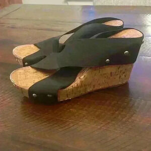 Charming Charlie Cork Wedge Studded Black Sandals Size 9. Has some wear by the toes and the back of the heel. Other than that they are in great condition. Straps are comfy and stretchy. Super cute wedges for any season! Has a 4 inch heel.
