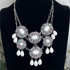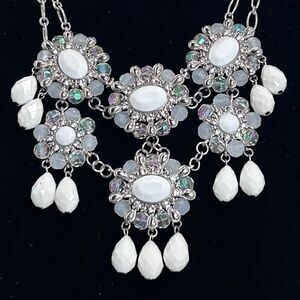 Charming Charlie Floral Bib Necklace Women's 7” Drop Silver-tone & White Chunky