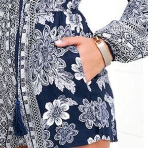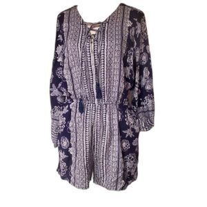 Charming Charlie Flower Power Blue Geometric & Floral Boho Long Sleeve Romper