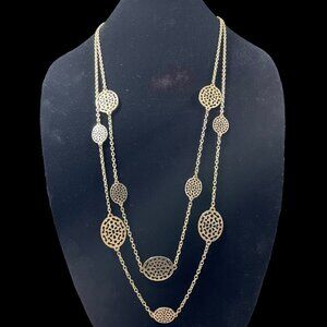 This elegant Charming Charlie layered necklace features multiple gold-tone chains adorned with intricate, circular cutout pendants. The long, flowing design makes it a perfect statement piece that can elevate any outfit, whether you're dressing up for a special occasion or adding a touch of glamour to your everyday look. The lightweight construction ensures comfort while the layered effect adds sophistication. This necklace is versatile and can be worn with various necklines, making it a must-have addition to your jewelry collection.