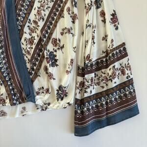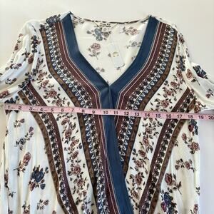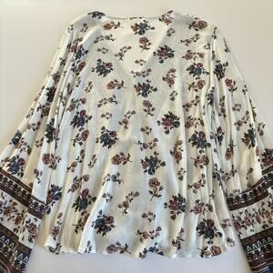Features: Charming Charlie Krazy Kat Floral Cream and Blue Surplice Long Sleeve Blouse; surplice v-neckline, long sleeves with flared cuffs, boho pattern, 100% viscose.
