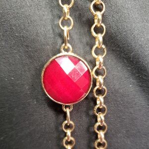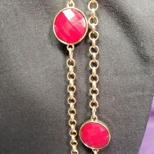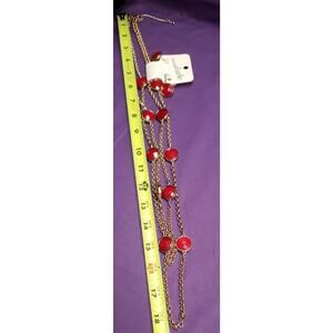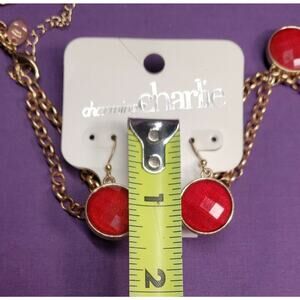 Charming Charlie Long Two Layer Gold Tone & Red Bead Necklace And Earrings Set. This is a beautiful long two layer necklace in gold tone. The chains are round links with large round faceted vibrant red stations. They drop about 16 and 19 inches. Matching earrings drop about 1.25 inches. Pre-owned and may have minor wear, still has tags and is in excellent condition.