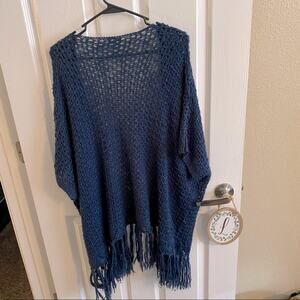 Charming Charlie Open Knit Poncho Sweater in blue in women's size small. Sweater does have arm holes. Fringe material bottom. Drapey. 100% acrylic. Sweater is in good used condition with no flaws or stains other than some minor wash wear. Please see close-up pictures for condition details. Open front.