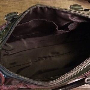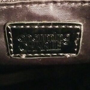 Charming Charlie Purple Purse with black accents. 7" wide bottom, with 4" wide at the top. 8" tall and 11" wide. Two open pockets and one large zippered pocket on inside. One medium zippered pocket on outside. Includes shoulder strap which is removable. Purple portion is textured with raised material in square shape. Never used.
