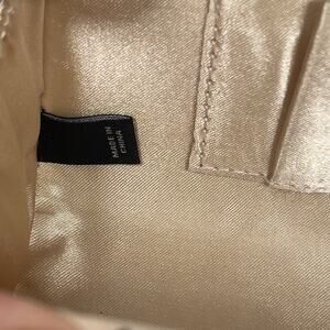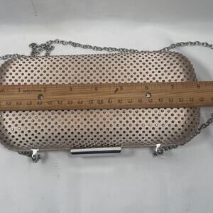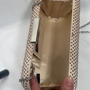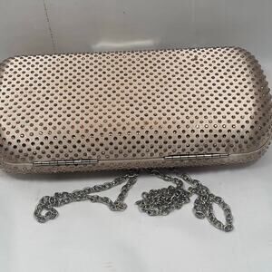 Charming Charlie RSVP Rose Colored Sequined Jeweled Hardcase Clutch Evening Bag Purse. Nice clean condition. Creamy beige satin type lining with small open pocket on one side. Silver metal chain is approx 46" long and detachable. Approx measurements: 8" x 3.5" x 1.75.