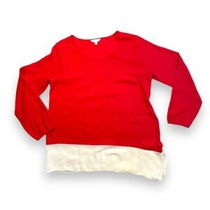 Excellent used condition Charming Charlie Red Asymmetrical Chiffon Tunic Sz XL. Asymmetrical color block Hip hem line adds chic style to this loose fitting tunic blouse!