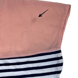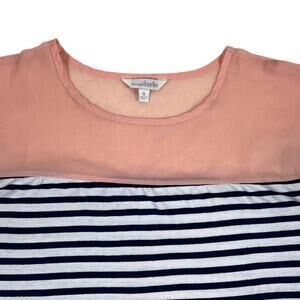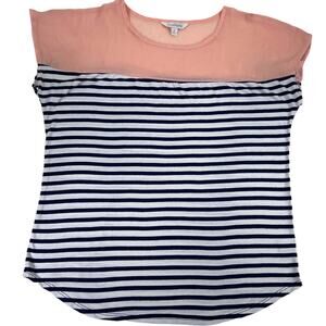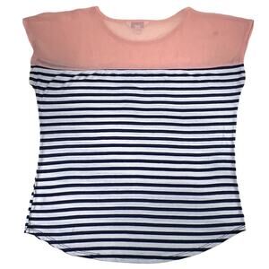 Women's navy blue and white striped t-shirt blouse with sheer peach chiffon shoulder panel from Charming Charlie. SMALL 52% Rayon 42% Polyester 6% Spandex Hand wash cold-hang dry. Due to light & screen variations, colors may vary slightly from the images