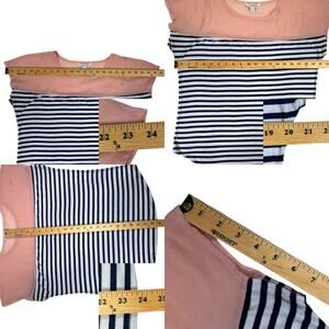 Women's navy blue and white striped t-shirt blouse with sheer peach chiffon shoulder panel from Charming Charlie. SMALL 52% Rayon 42% Polyester 6% Spandex Hand wash cold-hang dry. Due to light & screen variations, colors may vary slightly from the images