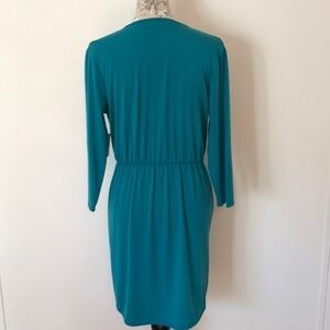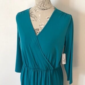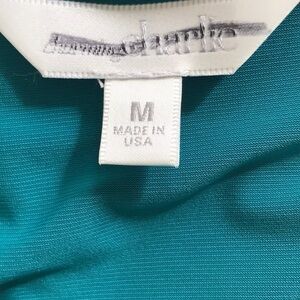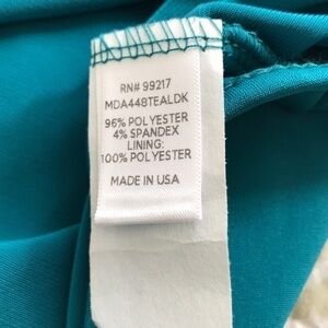 Excellent condition. Elastic waist. Front flat under arm side to side 20”. Length 36.5”. Pictures came out looking blue, but greenish Blue teal color.