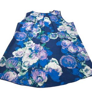 Stylish women's sleeveless blouse featuring a vibrant blue, purple, and white floral print. Made from 100% polyester for a comfortable fit.