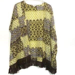Charming Charlie Yellow and Brown Open Kimono with Brown Fringe. Brown, yellow, and white with geometric designs that runs across the kimono. Great pre-owned condition, no visible defects.