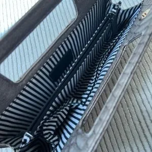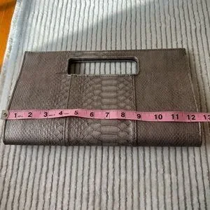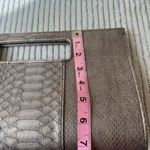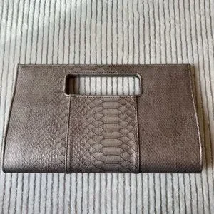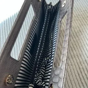 Beautiful silver metallic, snakeskin clutch. Magnetic closure. Many pockets and an interior zipper. Interior fabric is cute black and white stripe. Very clean and like new. Only flaw is a blemish on back by back handle. It is pictured. 12 1/4 inches by 7 1/2 inches. Great bag!