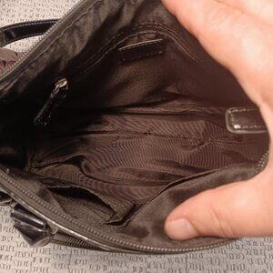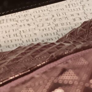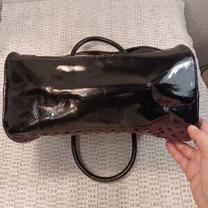 Eggplant purple and black colors in faux patent leather, no material tags present