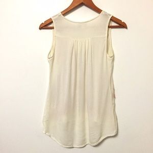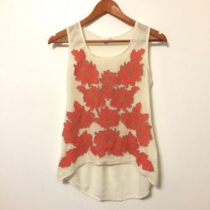 Adorable high low sleeveless top featuring an appliqué on mesh overlay panel in the front. No cami necessary as that section is also lined. Lovel coral flowers with tan stitching on an ivory base. Brand is Charming Charlie. In EUC with stains or holes.