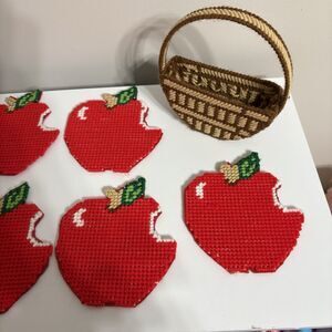 Charming Handmade Needlepoint Set of 6 Apple Coasters In Basket Holder Caddy