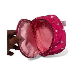 Delightful kids backpack featuring a heart pattern. Comes in a vibrant pink with a cream heart pocket. Ideal for school or day trips.