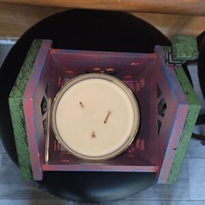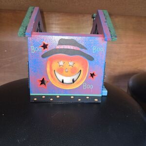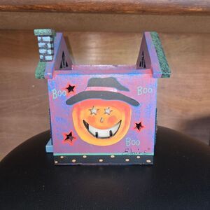 Brighten your holiday decor with this charming house featuring a delightful snowman. The vibrant orange and green accents add a festive touch to any room. This holds the large candles in a glass jar, candle not included, for illustrative purposes only.