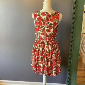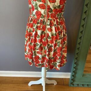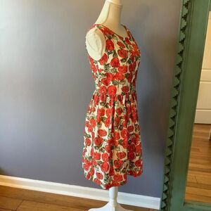 Step out in style with this delightful floral print dress, perfect for sunny days and special occasions. The dress features a classic sleeveless design with a round neckline and a flattering fitted bodice that flows into a flared skirt. Its vibrant red roses against a light background create a lovely and feminine look. Made from breathable fabric, it's ideal for comfort and ease of movement. Pair it with sandals for a casual look or dress it up with heels for an evening out. Size small.