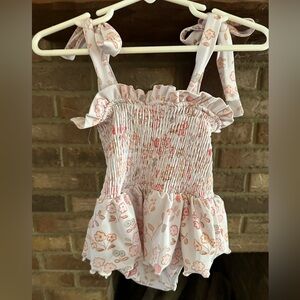Sweet baby girl swim suit featuring a floral print, adjustable tie straps and button snap stride for easing changing. Designed by Charming Mary.