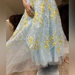 Stunning party dress. Delicate organza & floral lace fabric with beads. Exquisite removable Hand-beaded elastic waistband.