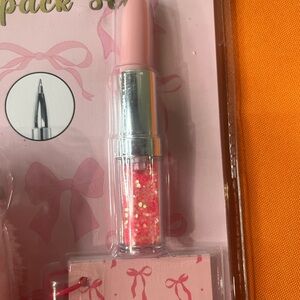 Cute mini cat backpack set with a pink bow design. Comes with a mini backpack keychain, lipstick pen, and mini journal.