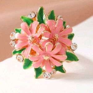 Delight in this charming floral ring with pink petals and green leaves, enhanced by sparkling crystals. A perfect accessory to elevate your style.