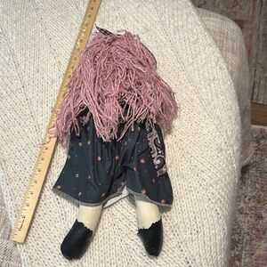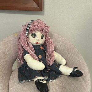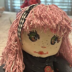 Delight your child with this charming rag doll featuring pink hair and a cute black dress. Perfect for imaginative play and cuddling.