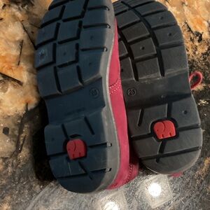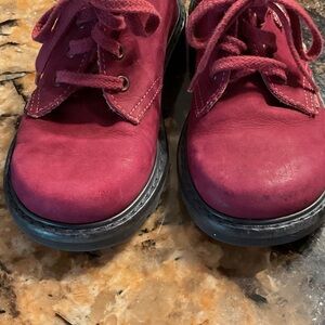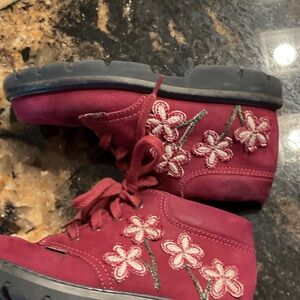 These charming burgundy leather kids boots feature a delightful floral design, perfect for adding a touch of fun to any outfit. Comfortable and stylish, they're ideal for little adventurers. Euro size 25 w conversion to US 8 1/2-9 toddler size. Soft Leather inside and outside. Good to very good condition.