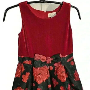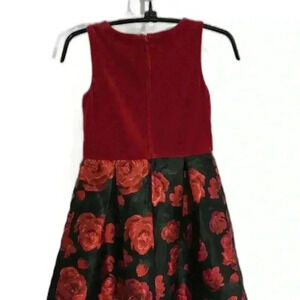 Dress your little one in this delightful red velvet and floral dress, perfect for special occasions or everyday wear. The bodice features soft, luxurious velvet fabric in a vibrant red, while the skirt showcases a beautiful floral pattern adorned with blooming roses on a dark green background. This dress is designed for comfort and style, making it a versatile addition to any wardrobe.