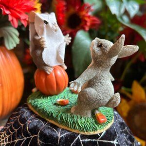• Mouse in ghost sheet standing on pumpkin trying to frighten another mouse