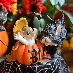 • Mouse popping out of “BOO” pumpkin; frightened black cat w/hair standing on end