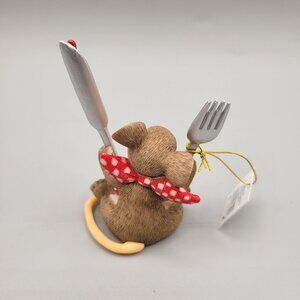 Charming Tails resin figurine and lapel pin. This figurine is called "Hungry for More," designed by artist Dean Griff, item number 4040114. Depicts Mackenzie Mouse sitting on a paint pallet with a dripping paintbrush. The lapel pin is item # 4040114A and is also called "Hungry for More."