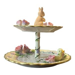 Delight in the whimsical charm of this two-tier stand featuring a playful bunny and duck. Perfect for adding a touch of nature to your dining decor. The stand showcases beautiful pink and cream hues, making it a lovely centerpiece for any occasion.