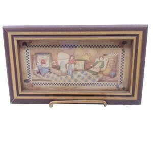Charming Vintage Framed Folk Art Print With Quilting & Sewing Theme 8"x 4"
