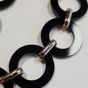 This stunning necklace features bold black circles linked with elegant gold accents. Perfect for adding a touch of sophistication to any outfit.