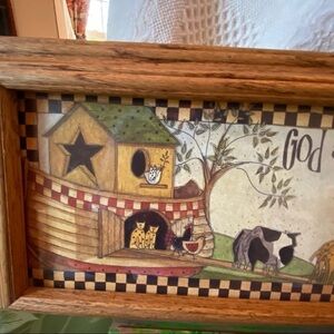 Charming framed wall art of animals disembarking Noah’s ark. Sweet kitchen decor