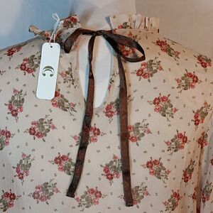 This New with tags sheer tan with pink and red florals, pleated front with elastic waist Charming Charlie Blouse is a size Small with a pit to pit measuring 20" with a length of 24". All offers are welcome.