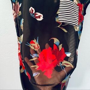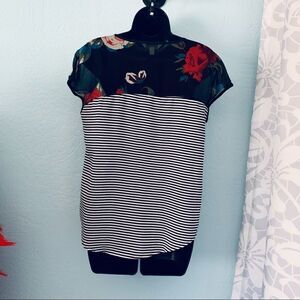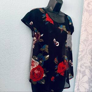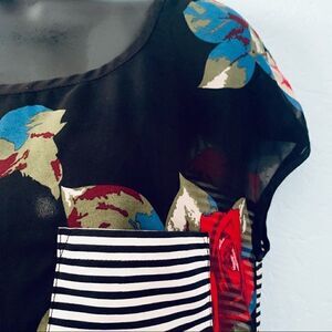 Pretty semi sheer floral/striped blouse. Single front pocket. Scoop neck. Slight high/low hemline. Short sleeve. 100% polyester. No flaws. Charming Charlie. Size small
