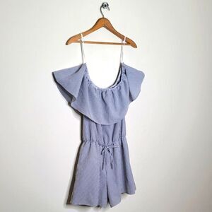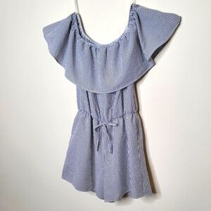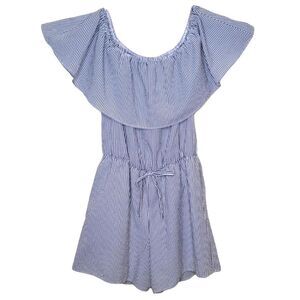 This is an adorable Charming Charlie Romper that features blue and white stripes, off