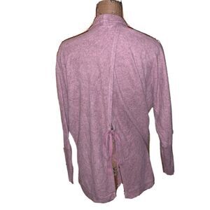 Purple cardigan, open front, cross cross in back with a tie. Polyester/Rayon blend. Soft and comfy. In good condition