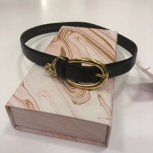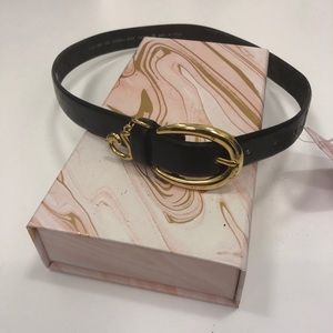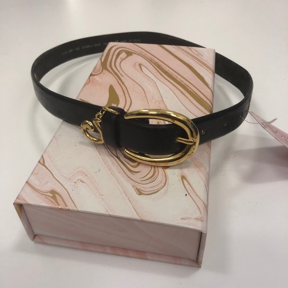 Black wide belt with gold buckle and gold charm