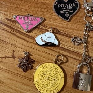 Stylish Prada keychains in black, pink, and silver. Perfect for adding luxury to your accessories. PURCHASE IS FOR ONE.