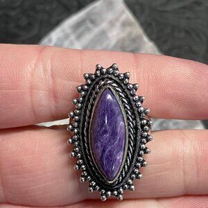 Ring of a natural Charoite stone crystal in a 925 silver plated antique styled setting with swirls. Size 7.