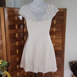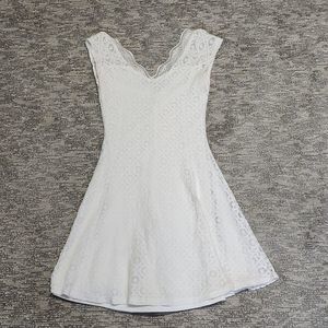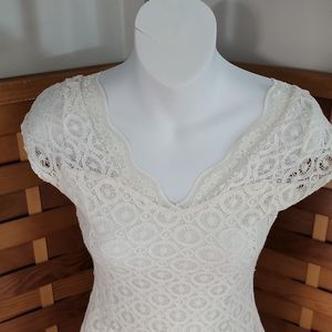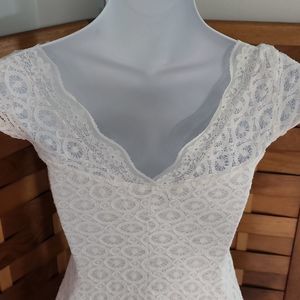 Charolette Russe brand white lace dress. Size Small. very good pre owned condition. fully lined. strechy material. measurements are 29 Inc in length from shoulder to hem and 16 inches across the chest from arm pit to arm pit.