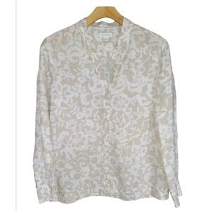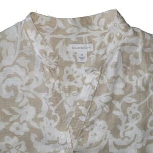 Charter Club 100% Linen Floral Button Up Roll Tab Top Size 14 Beige White Beachy