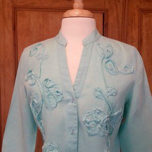 Charter Club 100% Linen Raised Applique button-down collarless blouse.