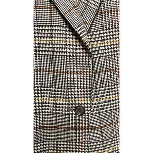 Pattern: Plaid, featuring a mix of brown, beige, and yellow lines, possibly a Prince of Wales check.