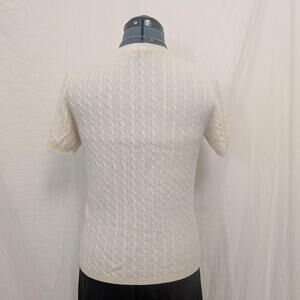 This cream-colored cable knit sweater from Charter Club is crafted from 2-ply 100% cashmere, offering a soft, luxurious feel with a classic silhouette. Features a crew neck, short sleeves, and a fitted shape that layers beautifully under jackets or over skirts. Made in China.