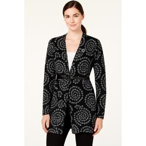Chic and versatile, this Charter Club cardigan features a striking black-and-gray circular dot pattern for a modern, textured look. Designed with an open front and no closure, it’s easy to style — wear it open for a relaxed look, belt it at the waist for shape, or fasten with a favorite brooch for an elegant touch. The lightweight knit drapes beautifully, making it perfect for layering over camisoles, turtlenecks, or blouses through any season.