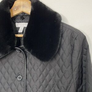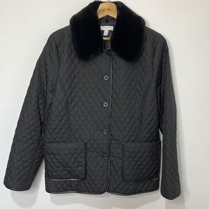 Charter Club Black Quilted Womens Coat Equestrian Lightweight Faux Fur Collar PM